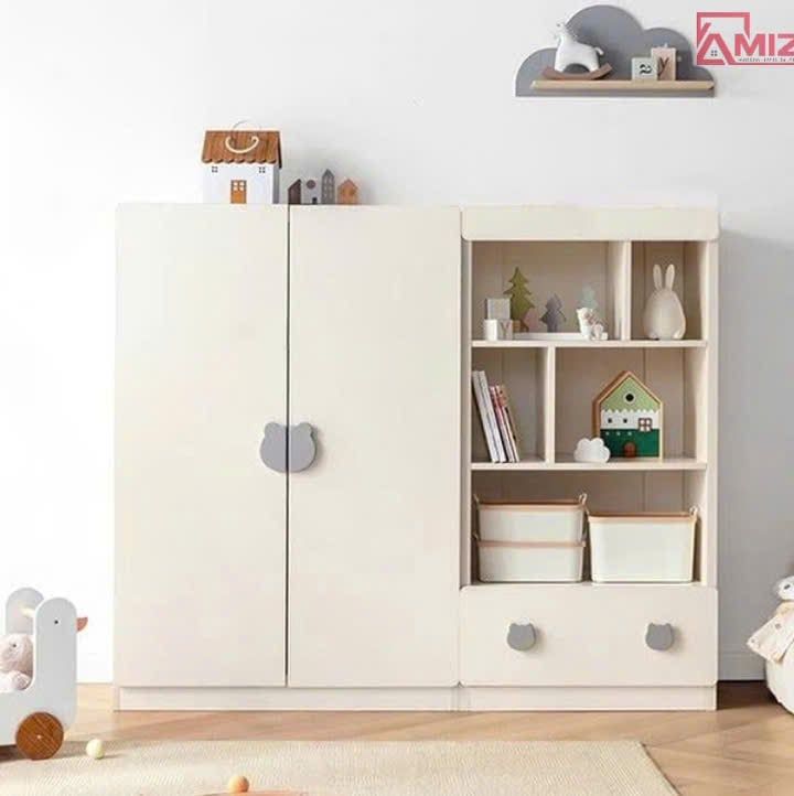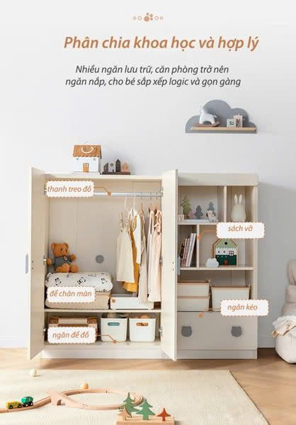 Tủ quần áo đa năg thiết kế với chiều cao phù hợp với chiều cao trẻ giúp trẻ dễ dàng tự sắp xếp đồ. Bên cạnh đó với không gian lưu trữ đa dạng, kết hợp với tủ lưu trữ đồ để bé cất giữ và trưng bày đồ chơi, sách vở vô cùng tiện lợi.
