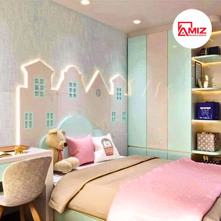 Tone màu pastel xanh – hồng – trắng hài hòa, giúp cân bằng cảm xúc, kích thích sự sáng tạo và trí tưởng tượng phong phú của trẻ.