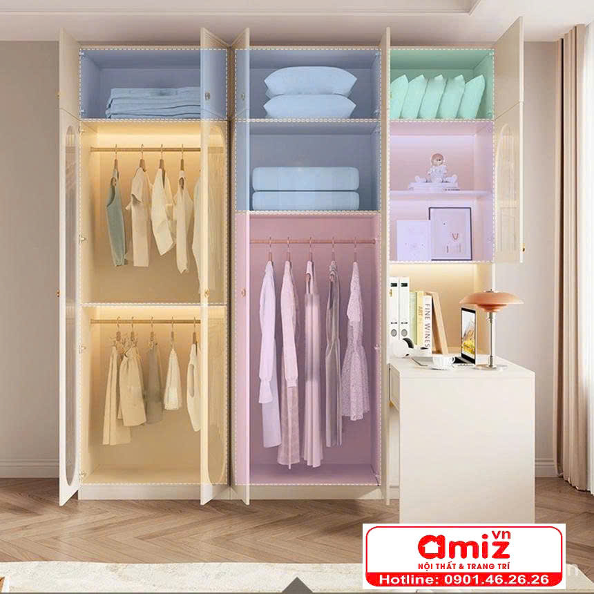 Sản phẩm có nhiều ngăn tủ lớn, giúp để được nhiều đồ dùng hơn. Ngoài ra tủ còn được trang bị bàn làm việc tích hợp tủ, giúp tiết kiệm diện tích căn phòng
