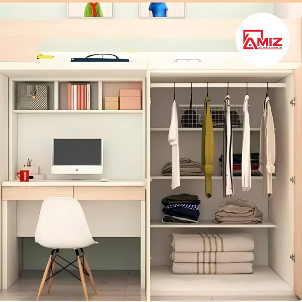 Tủ quần áo và bàn học tiện lợi được tích hợp trong giường