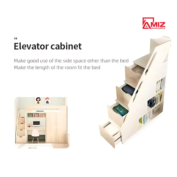 Không giống những sản phẩm giường tầng đơn giản khác, mẫu giường tầng trẻ em GT-439 có cấu tạo đặc biệt hơn tạo nên sự mới lạ và hút mắt. Không chỉ vậy, sản phẩm này có điểm nhấn ấn tượng nhất chính là chiếc tủ quần áo tối ưu không gian phía dưới kèm bàn học tiện lợi. Bậc cầu thang cấu tạo mặt phẳng lớn và chắc chắn, sẽ giúp các bé có thể yêu tâm di chuyển lên xuống một cách an toàn.