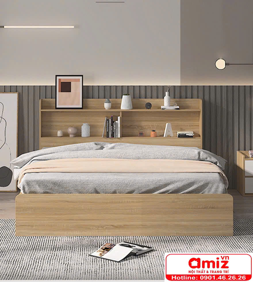 Phần đầu giường được thiết kế ngăn kệ để đồ tiện lợi giúp người dùng trưng bày đồ lưu niệm, đồ đạc cá nhân