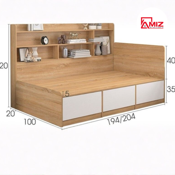 Giường ngủ hiện đại bằng gỗ thiết kế liền giá trưng bày AMIZ-002A là một trong những mẫu sản phẩm mới được ra mắt, yêu thích nhất hiện nay. Kích thước sản phẩm mẫu phù hợp làm giường ngủ 1 người, nhưng bạn cũng có thể điều chỉnh kích thước theo nhu cầu. Đặc biệt khi mua sắm giường ngủ tại Go Home, khách hàng còn có thể lựa chọn màu sắc và kiểu vân gỗ.