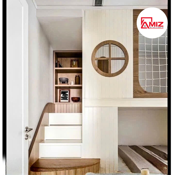 Thiết kế độc đáo, lấy cảm hứng từ cabin tàu thủy, với cửa sổ tròn và lưới chắn an toàn, tạo nên không gian vui chơi riêng biệt, kích thích trí tưởng tượng cho trẻ nhỏ.