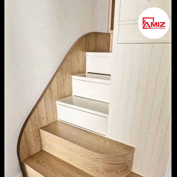 Cầu thang tích hợp ngăn kéo, kết hợp tủ kệ trang trí, giúp lưu trữ đồ đạc gọn gàng, khoa học.