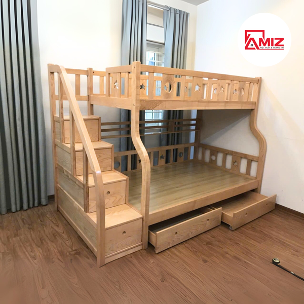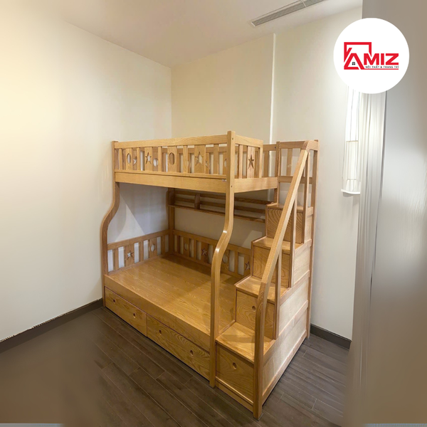 + Cầu thang chắc chắn với các bậc thang có kích thước tương đối lớn, đảm bảo an toàn cho bé khi di chuyển. Giường tầng trẻ em cao cấp là một sản phẩm thiết thực cho các gia đình có con nhỏ. Cùng với ưu điểm tiết kiệm không gian.