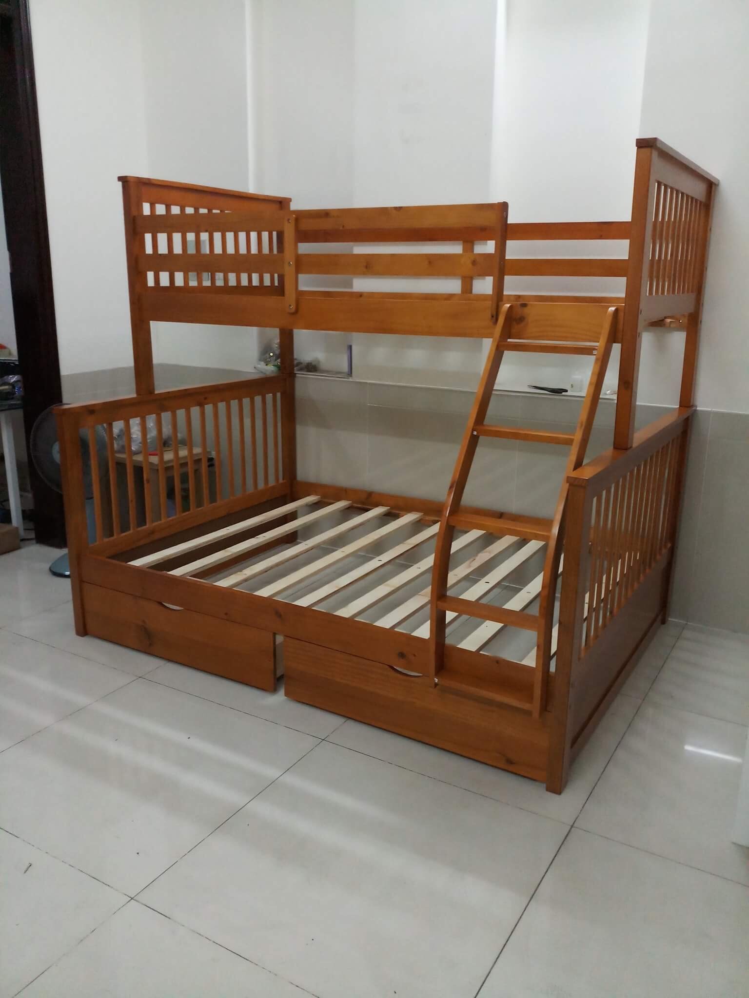 Sản phẩm được làm từ gỗ thông cao cấp đã được xử lý chống mối mọt, cong vênh. Đặc biệt, mẫu giường tầng gỗ K.Bed này còn có 2 ngăn kéo rộng rãi thoải mái có thể đựng những đồ dùng cá nhân. Thiết kế lan can chắn an toàn khi nằm ngủ. Cầu thang đơn rộng rãi và vững chãi giúp bạn có thể lên xuống dễ dàng.