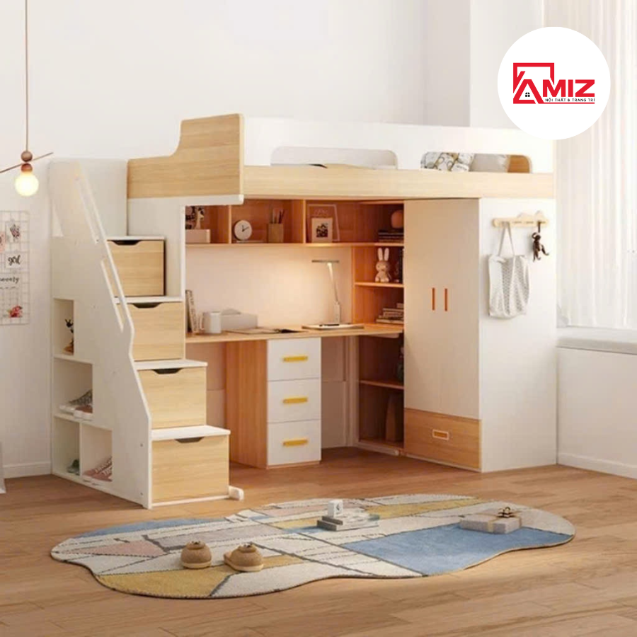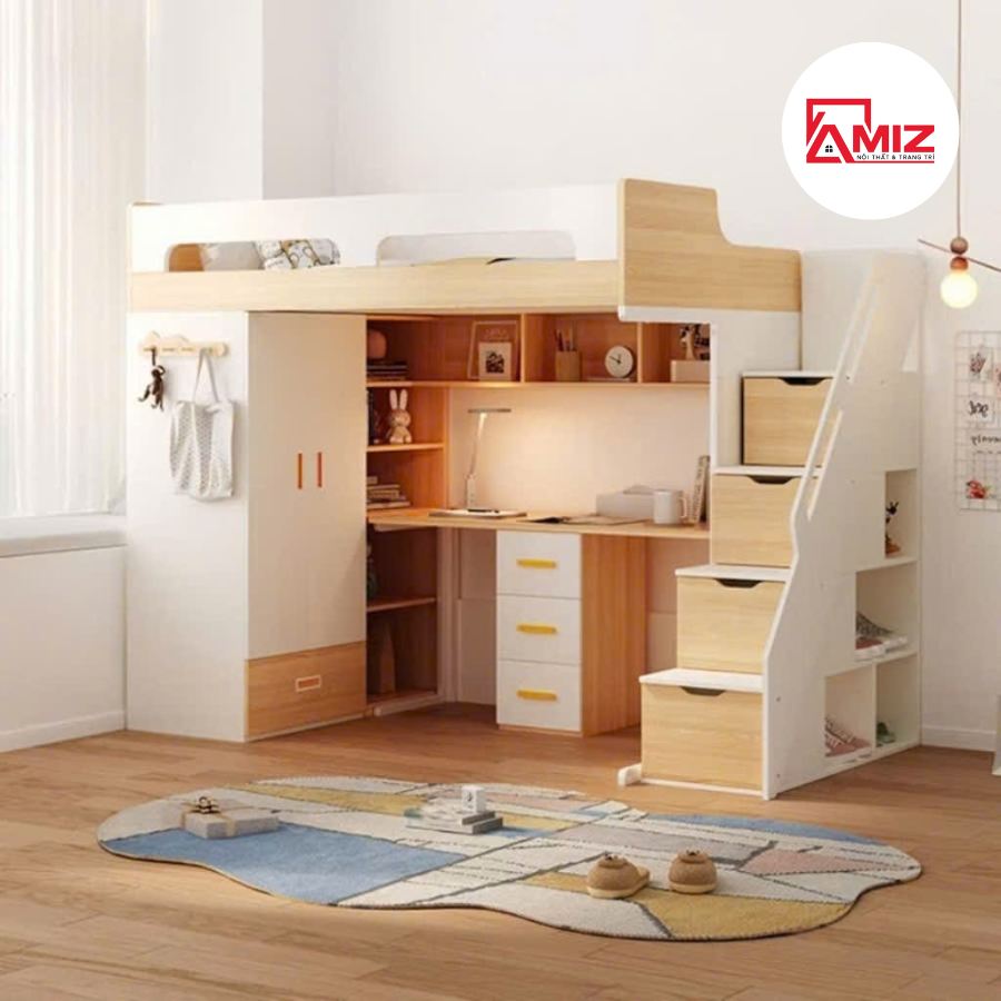 Giường tầng trẻ em kết hợp tủ quần áo và bàn học thông minh Amiz - GT016 được thiết kế đa năng, tích hợp tủ quần áo, bàn học và kệ sách ngay bên dưới, giúp tối ưu không gian sử dụng. Cầu thang bên hông có tích hợp ngăn chứa đồ tiện lợi, hỗ trợ lưu trữ gọn gàng. Thành giường tầng trên chắc chắn, phù hợp với nệm dày từ 10 – 15 cm, đảm bảo an toàn khi sử dụng. Bậc cầu thang rộng, chắc chắn, giúp bé di chuyển dễ dàng và an toàn mỗi ngày.
