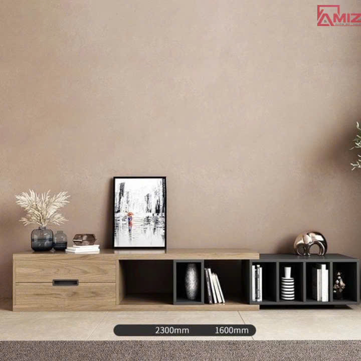 Kệ tivi được thiết kế không tốn quá nhiều diện tích giúp khách hàng có thể thoải mái điều chỉnh, dễ dàng phối hợp với món nội thất khác như: bộ sofa gỗ góc, vách trang trí, bàn trà, kệ trang trí,.. trong phòng khách.