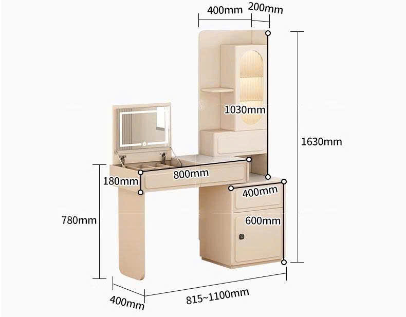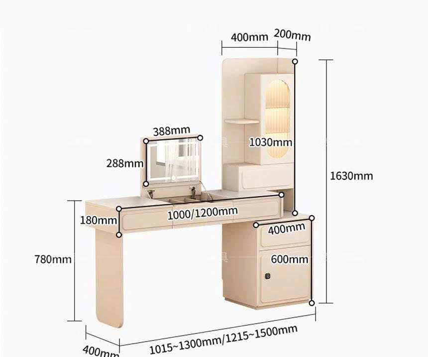 Đặc biệt, chiều cao chân bàn 60cm của sản phẩm giúp tạo ra không gian thoải mái phía dưới để bạn có thể ngồi và trang điểm một cách dễ dàng và thoải mái. Điều này mang lại sự tiện ích và thoải mái tối đa cho người sử dụng.