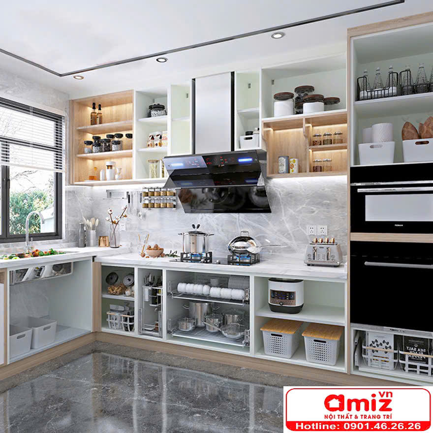 Mẫu tủ bếp gỗ đa chức năng AMIZ-001 có thể được thiết kế theo bếp chữ I hoặc bếp chữ L, mang đến sự ngăn nắp và gọn gàng cho không gian. Đây là một trong những mẫu tủ bếp gỗ đẹp, nhỏ gọn rất phù hợp với căn bếp nhỏ của nhà ống hoặc nhà chung cư. Bên cạnh đó, sự kết hợp tinh tế giữa gam màu trắng và vân gỗ của sản phẩm tạo cảm giác không gian nhà bếp rộng rãi hơn và gần gũi thiên nhiên.