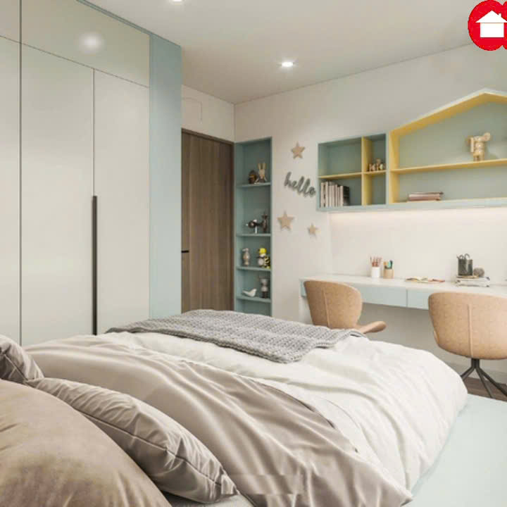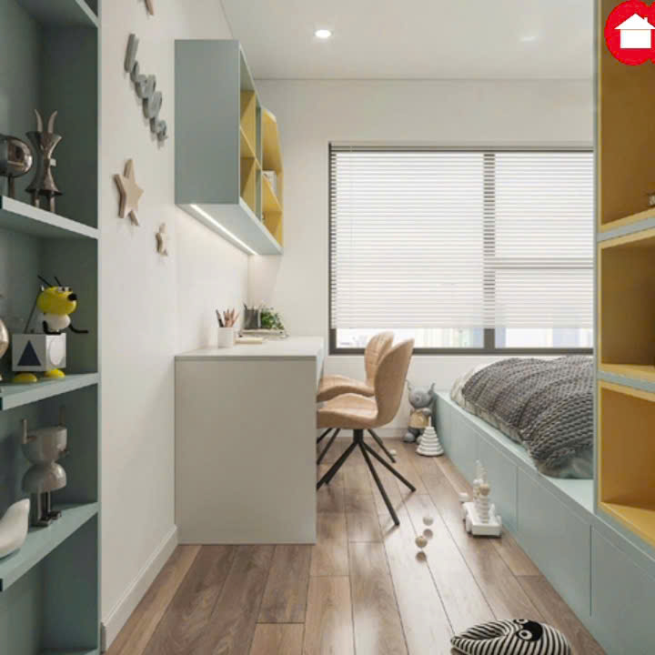 Với thiết kế được tối ưu hóa công năng với giường ngủ dạng hộp tích hợp tủ quần áo, giúp tiết kiệm diện tích mà vẫn đảm bảo không gian lưu trữ cho quần áo và đồ chơi. Đối diện giường là khu vực học tập được bố trí khoa học với bàn học và kệ sách treo tường, tạo nên một góc học tập yên tĩnh và truyền cảm hứng cho bé. Bên cạnh đó, một kệ trang trí đứng sát tường sẽ là nơi để bé trưng bày những món đồ chơi yêu thích hay những vật dụng cá nhân, góp phần hoàn thiện không gian sống sinh động, gọn gàng và mang dấu ấn riêng của con.