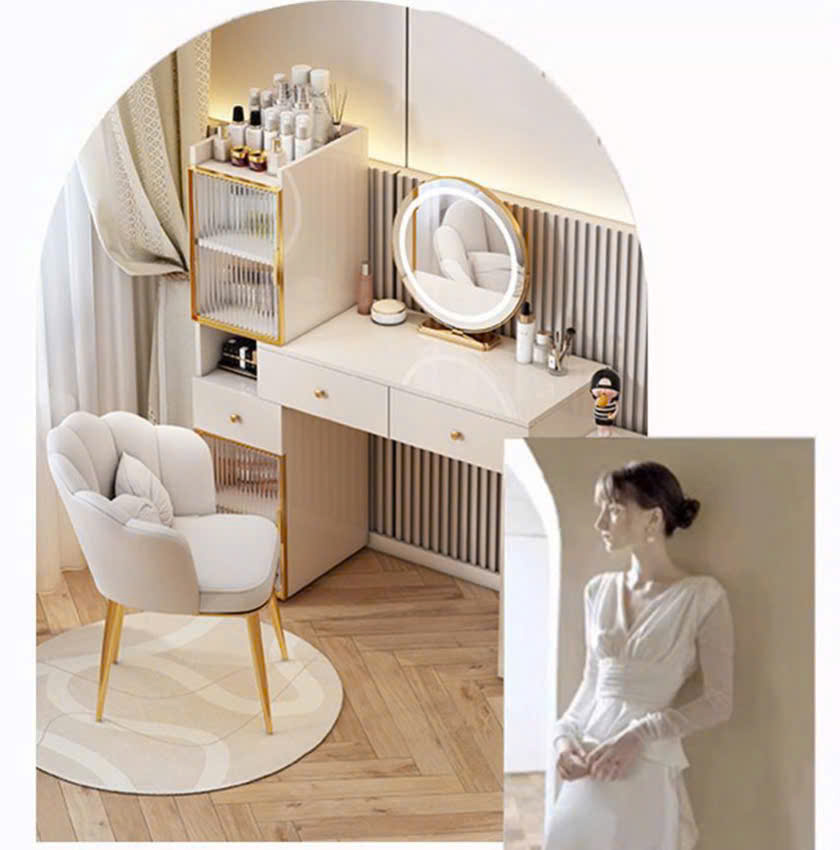 Kệ bàn trang điểm liên kết với tủ lưu trữ vừa giúp tối ưu hóa không gian vừa mang lại không gian lưu trữ rộng lớn. Bạn có đủ không gian để tổ chức và sắp xếp mỹ phẩm, phụ kiện trang điểm và các vật dụng cá nhân một cách gọn gàng và tiện lợi. Đặc biệt là với thiết kế linh hoạt, chúng ta còn có thể thay đổi kích thước sản phẩm sao cho phù hợp với không gian sử dụng.