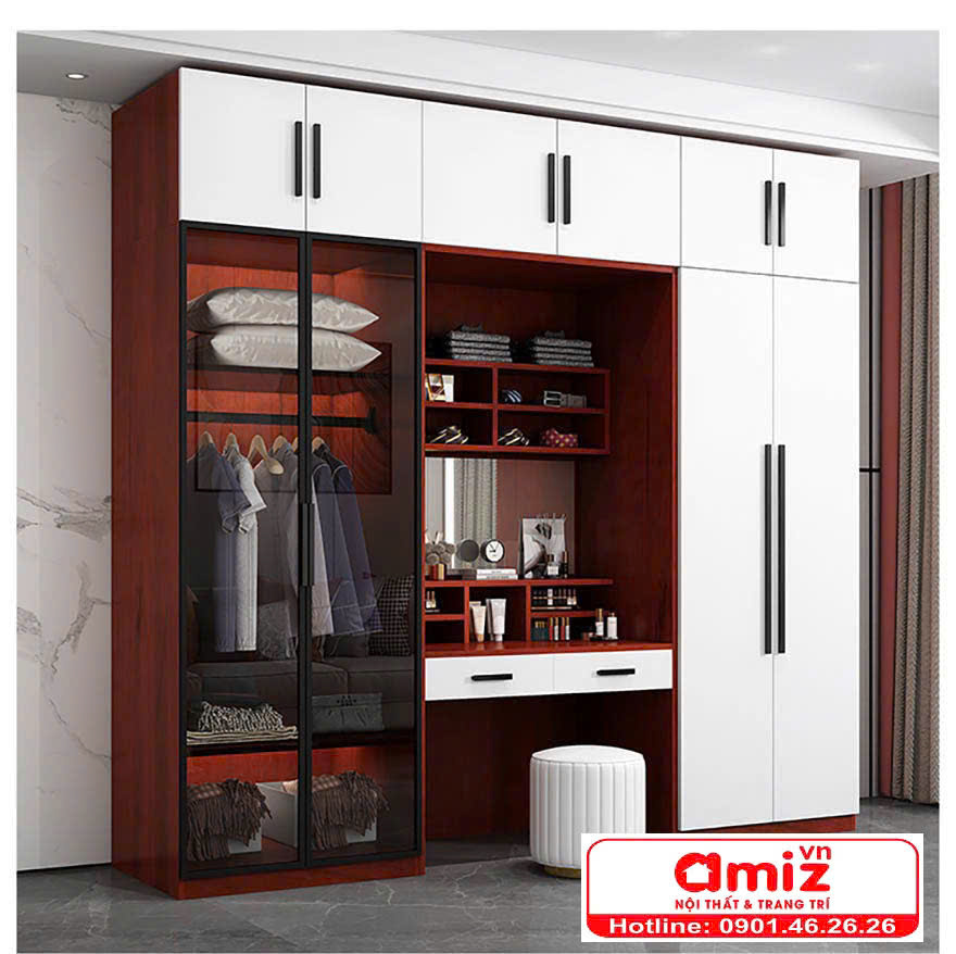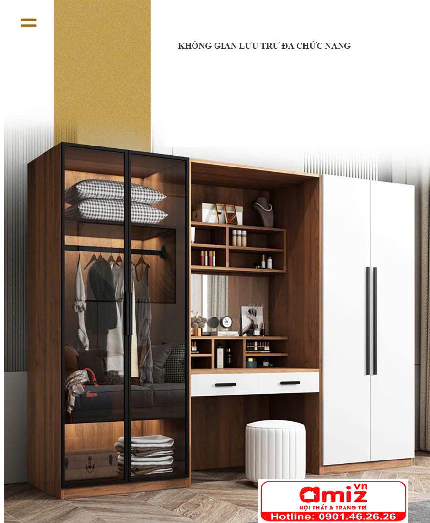 Tủ quần áo kết hợp bàn trang điểm AMIZ-008 là một sản phẩm đa năng và tiện lợi trong không gian phòng ngủ. Thiết kế tinh tế của tủ giúp bạn dễ dàng sắp xếp và lưu trữ các bộ quần áo của mình, cùng với đó là khả năng tối ưu hóa không gian phòng ngủ. Hiện nay, mẫu tủ áo cánh kính này rất được yêu thích và lựa chọn nhiều, bạn hãy cân nhắc và chọn mua mẫu tủ quần áo cánh kính cho phòng ngủ của mình nhé!