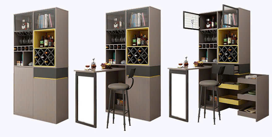 Mẫu tủ rượu đa năng này gây ấn tượng với khách hàng với thiết kế thông minh 3 trong 1, tích hợp tủ để rượu, tủ để đồ và bàn ăn. Bạn có thể kéo ngăn tủ và bàn ăn tách riêng cực tiện lợi, khi không dùng đến thì gấp gọn lại nên tiết kiệm được rất nhiều diện tích.
