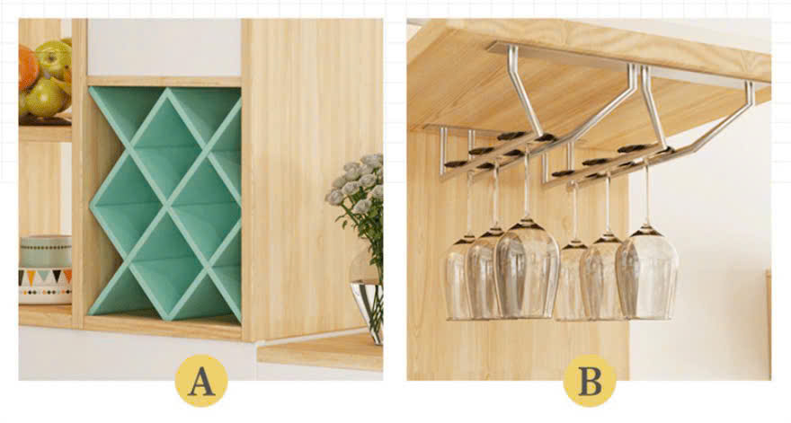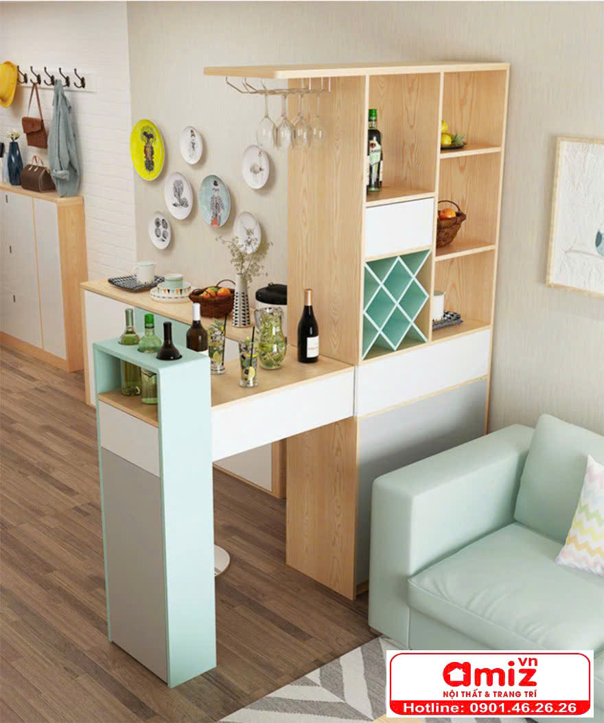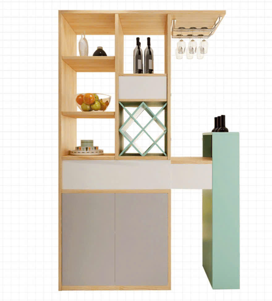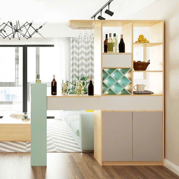 Tủ rượu gia đình có màu sắc vân gỗ kết hợp với màu sơn tươi sáng tạo điểm nhấn giúp không gian nhà bạn trở nên sang trọng hơn. Bên cạnh công dụng là để rượu, vật dùng, đồ đạc thì tủ còn được dùng như tấm chắn ngăn phòng giữa phòng khách và phòng bếp.