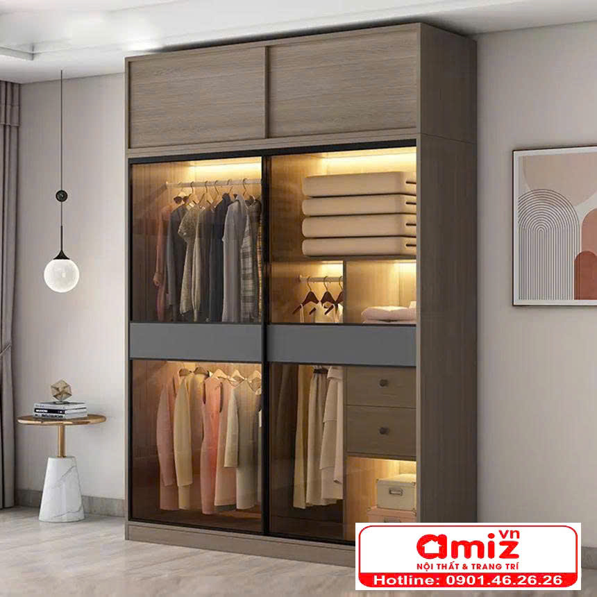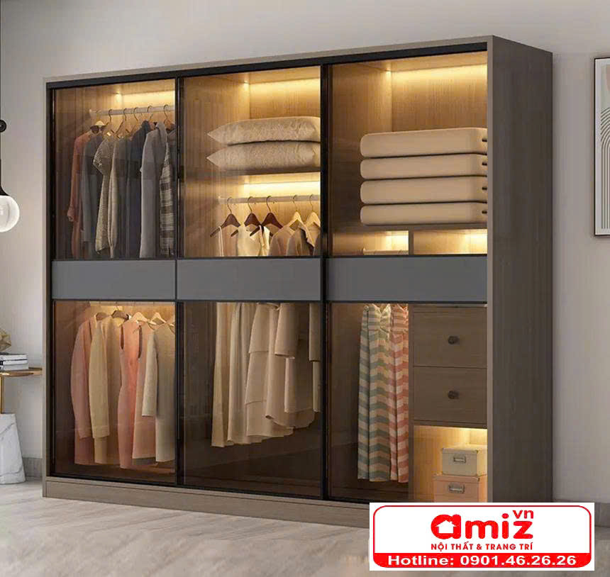 Mẫu tủ treo quần áo cánh nhôm kính phong cách hiện đại AMIZ-009 là một sản phẩm đại diện cho dòng tủ quần áo cánh kính cao cấp và sang trọng. Dưới đây là những điểm nổi bật của mẫu tủ quần áo cánh kính lùa này.